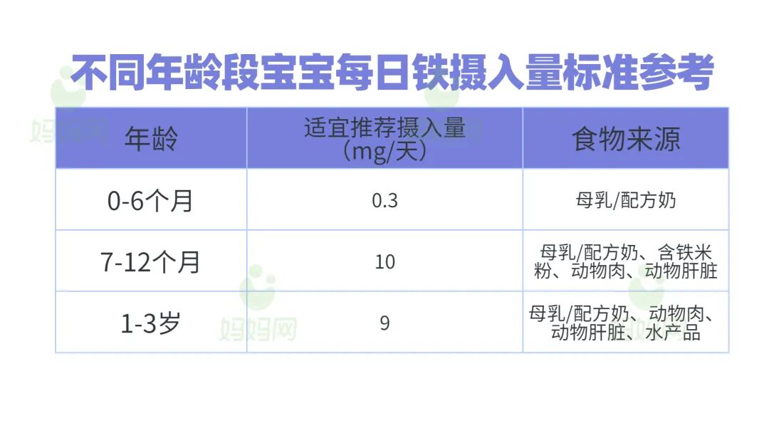 美国儿科学会建议,母乳喂养的宝宝在4个月大时开始补充铁元素(配方奶中添加了铁元素,所以配方奶喂养的宝宝不需要额外补充),6个月大时开始给宝宝添加富含铁元素的辅食。