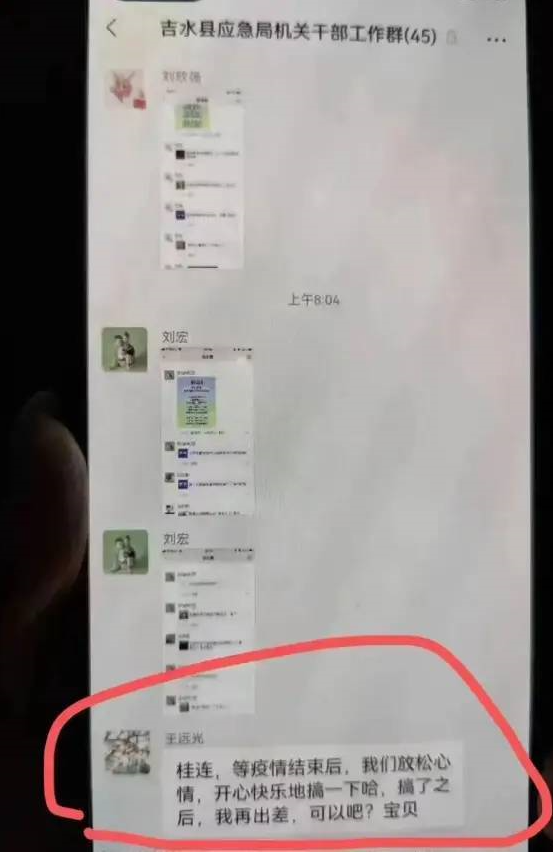 对于此事,当地教育局表示,已经报警处理。 类似事件并不是第一次发生。 之前就有某机关局长,一不小心把婚外情曝光在了工作群。 从曝光的信息来看,疑似江西吉安下辖的“吉水县应急局机关干部工作群”, 突然弹出一条消息: “桂连,等疫情结束后,我们放松心情,开心快乐地搞一下哈。 搞了之后我再出差,可以吧?宝贝!” 每一个字眼,都让人想入非非……
