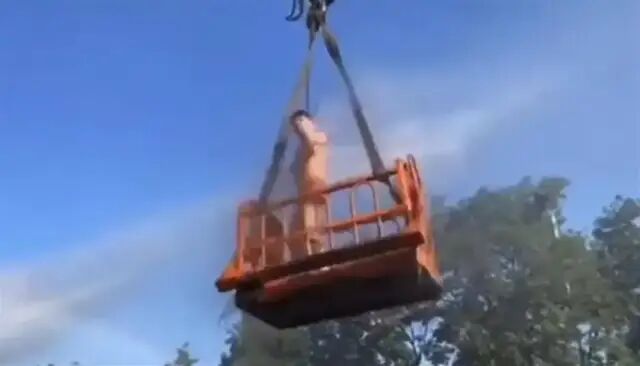 随后被人推向吊篮,吊车将吊篮吊到半空中,